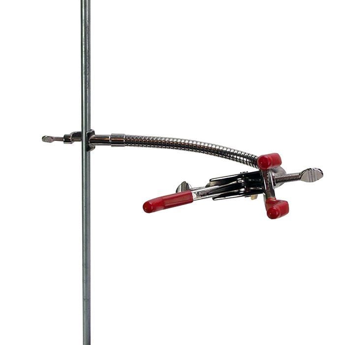The 3-Prong Clamp with Flexible Extension Rod from United Scientific is the ultimate solution for holding sensors, small glassware, or tubing in positions that standard rigid clamps cannot reach. Featuring a 305 mm (12 in.) nickel-plated "gooseneck" arm, this clamp can be bent into virtually any shape or angle and will maintain its position under loads of up to 1 pound. The 3-prong head provides a secure, three-point grip on objects up to 95.3 mm wide, while the integrated heavy-duty boss head connector attaches firmly to any standard laboratory support rod or frame with a diameter up to 22 mm.