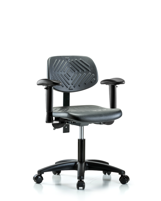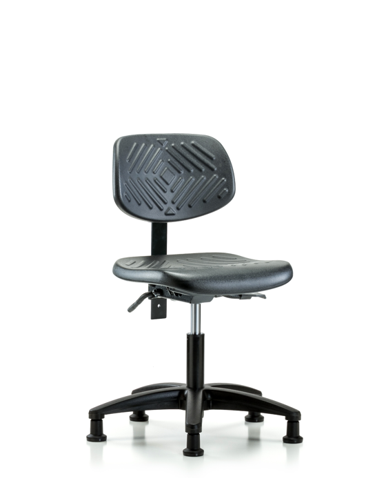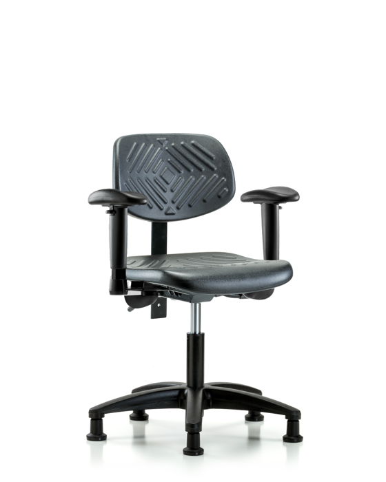 Black Polyurethane Nylon Base Chairs, Desk Height is adjustable from 17 - 22 inches from the top of the seat to the floor and features ergonomic adjustments including seat height and locking back tilt. Each chair is available with a nylon or chrome adjustable foot ring, locking seat tilt, 6-way adjustable arm rests. The black, nylon-reinforced fiberglass base with stationary, non-marring glides or casters are suitable for hard floors in chemical, soil, and puncture-resistant polyurethane.