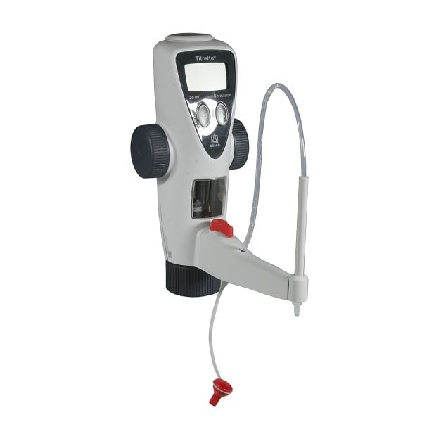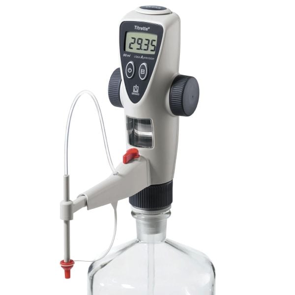 Titrette® is the first bottle-top burette to meet class A error limits for glass burettes. In addition, it stands out for easy titration, a compact design, excellent precision, an exchangeable dosing unit, and an optional PC interface. You can use the Titrette® to titrate quickly and reliably, even with restricted space and independent of available power connections - in the laboratory, in production, or in the field.