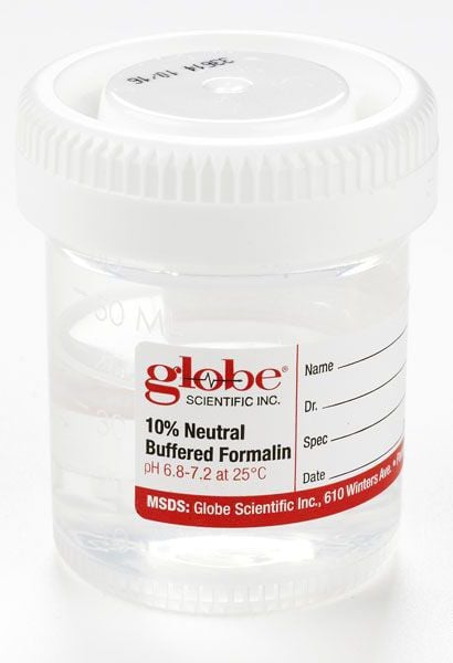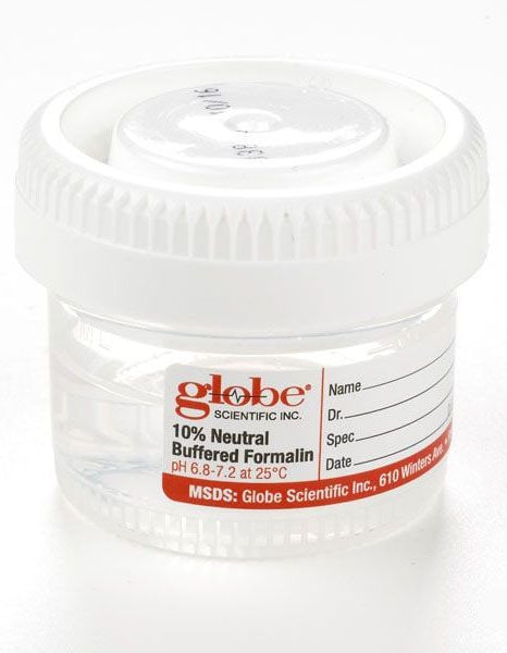 The Globe Scientific Formalin Filled Containers offer one of the best leak-resistant and air-tight closures on the market. The containers are prefilled half way with 10% neutral buffered formalin. The containers are packaged in 4 inner carry packs containing 24 containers in each (96/case).