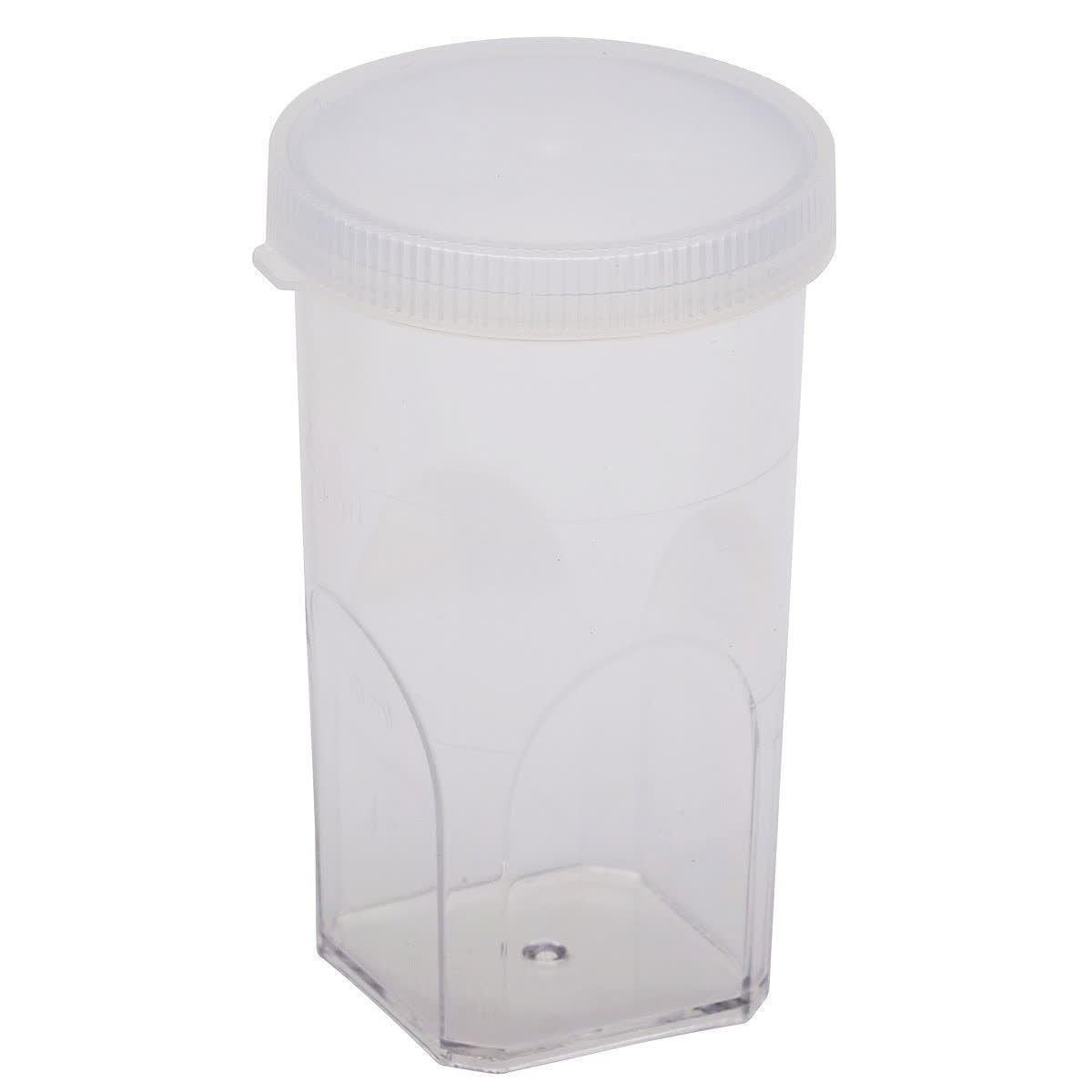 Vial, Coulter® Cup. Polystyrene with polyethylene lid. Container graduated at 10 and 20 ml. Tight fitting push-on lid assures leakproof fit. Closure easily opened with just one finger. Packed 200 per package, 1000/case.