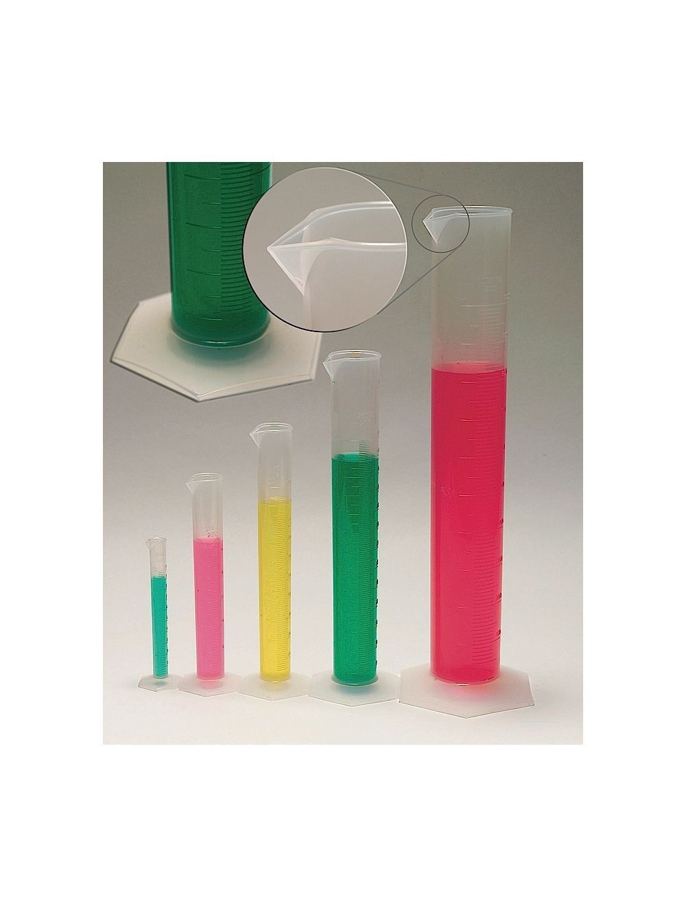 Our polypropylene one-piece measuring cylinders have raised graduations for easy readability. They are autoclavable and have excellent contact clarity. The hexagonal base provides excellent stability to the cylinder, and the tapered spout enables easy pouring of reagents. Stated tolerances are the same as graduated intervals below.