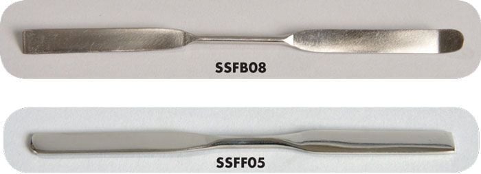 Stainless steel spatulas from United Scientific are available with flat or bent ends. Lengths range from 4 to 8 inches each, and they are sold in packs of 10.