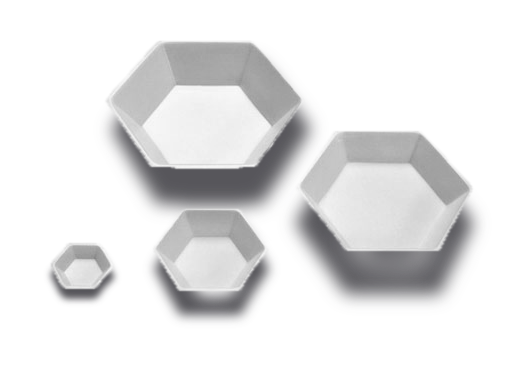Excellent weigh dishes for handling either solids or liquids. Provide excellent protection for balances and scales due to flat bottoms. Hexagonal dishes are easily bent into pouring spout