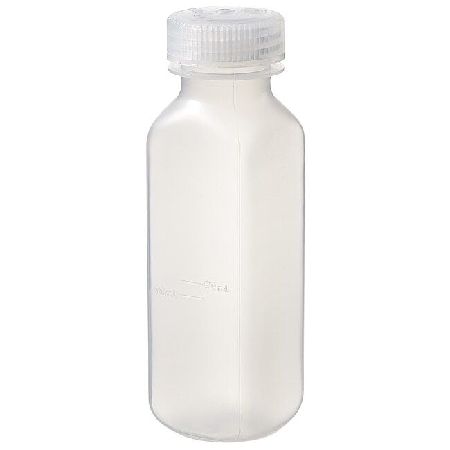 Easily view liquid levels with translucent Thermo Scientific™ Nalgene™ PPCO Wide Mouth Dilution Bottles, which have excellent chemical resistance to bases and weak acids. They offer a useful temperature range of -100°C (148°F) to +165°C (329°F). These bottles are graduated at 90 mL and 99 mL and are accurate to ±4 mL.