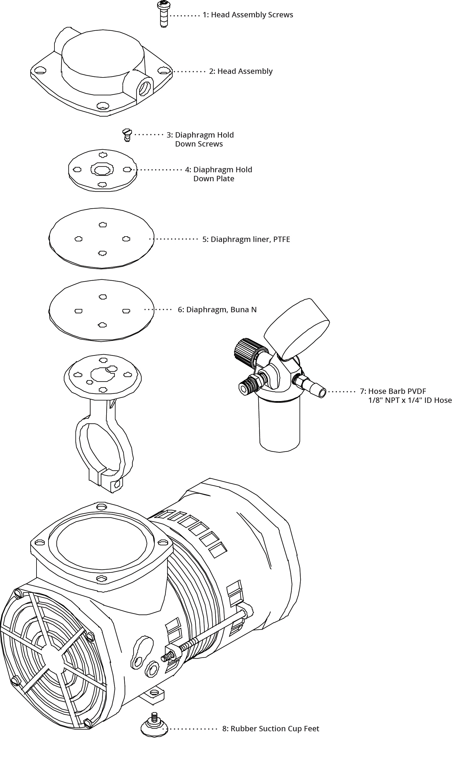 The Diaphragm Replacement Parts kit is the perfect solution for routine maintenance, providing all the necessary components for a quick and easy diaphragm rebuild. For more extensive overhauls, the Major Rebuild Parts kit includes all the components needed for a comprehensive rebuild of the equipment. Both kits contain high-quality, OEM parts that are specifically designed for the PILOT3000, ensuring your pump continues to operate at peak performance with a reliable, greaseless vacuum.