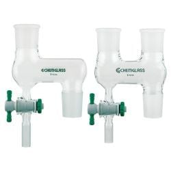 Compact and simple distilling adapter for use with Chemglass process reactors. Vapor flows upward freely and distillate is collected in to the small bowl below the joint and through the stopcock into a distilling receiver. Adapter has a lower inner joint and is available with one or two top outer joints. Lower stopcock is 10mm PTFE with a 3/4" outer diameter distillate takeoff for use with a compression fitting and TFE tubing. Adapter is 6" overall wide with joints offset 95mm center to center.
