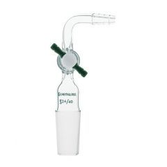 The Chemglass 90° Inner Joint Flow-Control Adapter with PTFE Stopcock is used to regulate the flow of gases or liquids into reaction systems. The stopcock has a bore of 2mm. The hose connection has an outer diameter of 8mm at the middle serration with the exception of CG-1020-45 which has an outer diameter of 14mm.