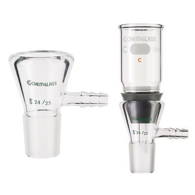 The Vacuum Filtration Adapter is used for reduced pressure filtration with plain stem buchner funnels. The top has a heavy duty tooled flare to accept the listed size pluro stopper. The hose connection is 10mm outer diameter at the largest serration.