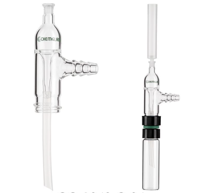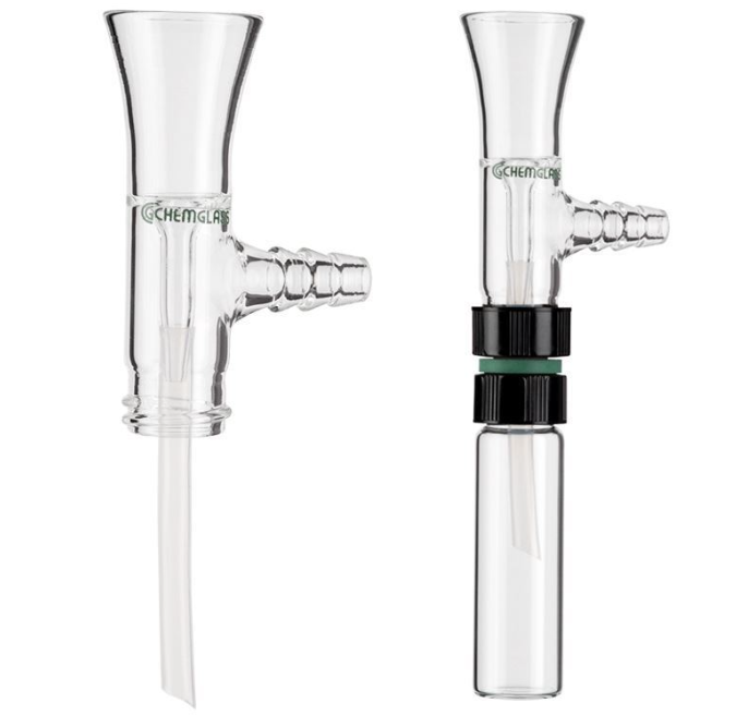 Vacuum Threaded Adapters are used for filtration directly into vials. There are three top configurations, with the bottom of all adapters having a 20-400 GPI thread for connection to vials using a CG-1318 Threaded Connector. Design incorporates a drip tube sealed within thread to prevent breakage and are supplied with a 2-1/2" PTFE delivery stem. The connection is 10mm outer diameter at the largest serration. The adapters are supplied with PTFE delivery system.