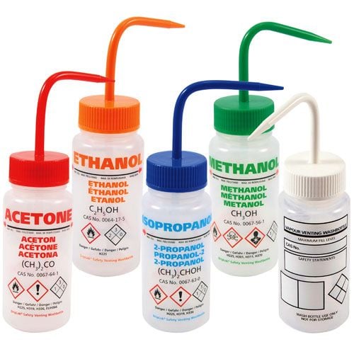 The Dynalon GHS wash bottles are available in four solvent labels which all include Globally Harmonized Symbols, NFPA diamond, risk phrases, and safety information. Each bottle also has 4 different languages printed on them (English, German, French, and Spanish).