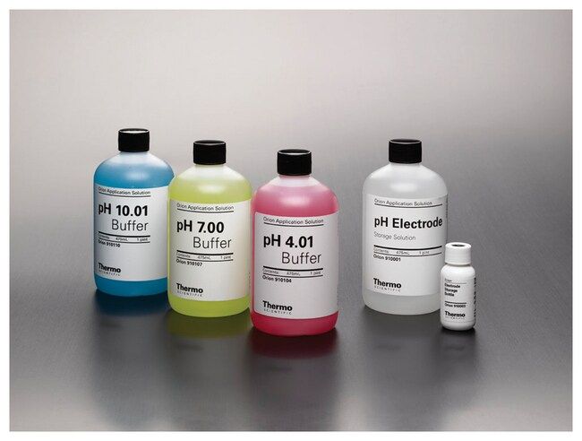 Includes: One 1 pint (475mL) bottle each of pH 4.00 buffer (910104), pH 7.00 buffer (910107), pH 10.01 buffer (910110) and standard pH electrode storage solution (910001) and one pH electrode storage bottle.