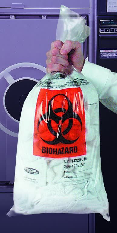 These bags are available clear or red with proper biohazard warnings, or clear without label. Rated for use at 135 C (275 F). Twist ties included.