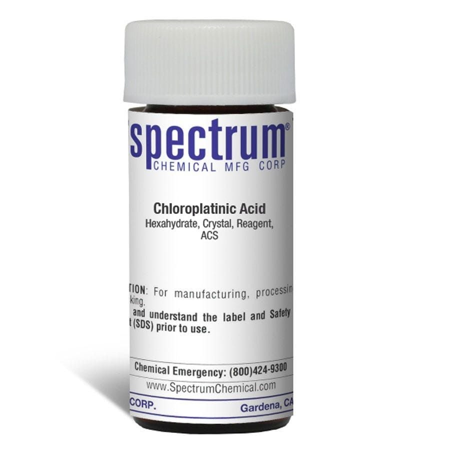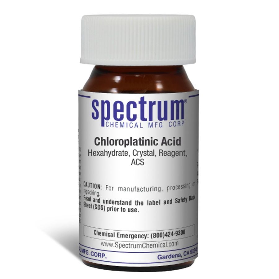 Choose the highest quality solutions and chemicals from Spectrum Chemical. Shop Chloroplatinic Acid, Hexahydrate, Crystal, Reagent, ACS, also known as hexachloroplatinic acid, is a soluble compound of platinum. It is used in ion-selective electrodes and determines the concentration of potassium. As an ACS grade quality reagent, its chemical specifications are the de facto standards for chemicals used in many high-purity applications and typically designate the highest quality chemical available for laboratory use. Spectrum Chemical manufactured Reagent ACS grade products meet the toughest regulatory standards for quality and purity.