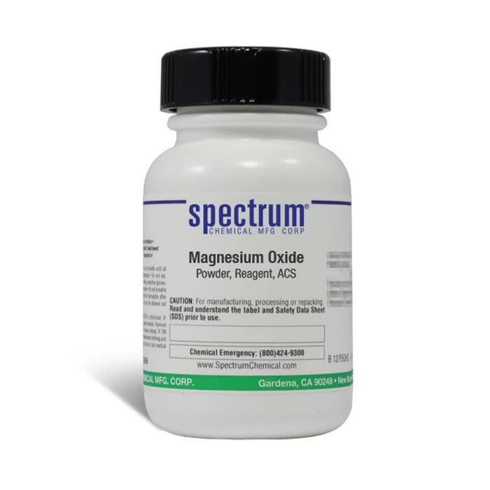 Choose the highest quality solutions and chemicals from Spectrum Chemical. Shop Magnesium Oxide, Powder, Reagent, ACS is a white solid mineral that is found naturally as periclase and is considered a source of magnesium. It is also considered a metastable compound. The Reagent grade denotes that this chemical is the highest quality commercially available and that the American Chemical Society has not officially set any specifications for this material. Spectrum Chemical manufactured Reagent grade products meet the toughest regulatory standards for quality and purity.