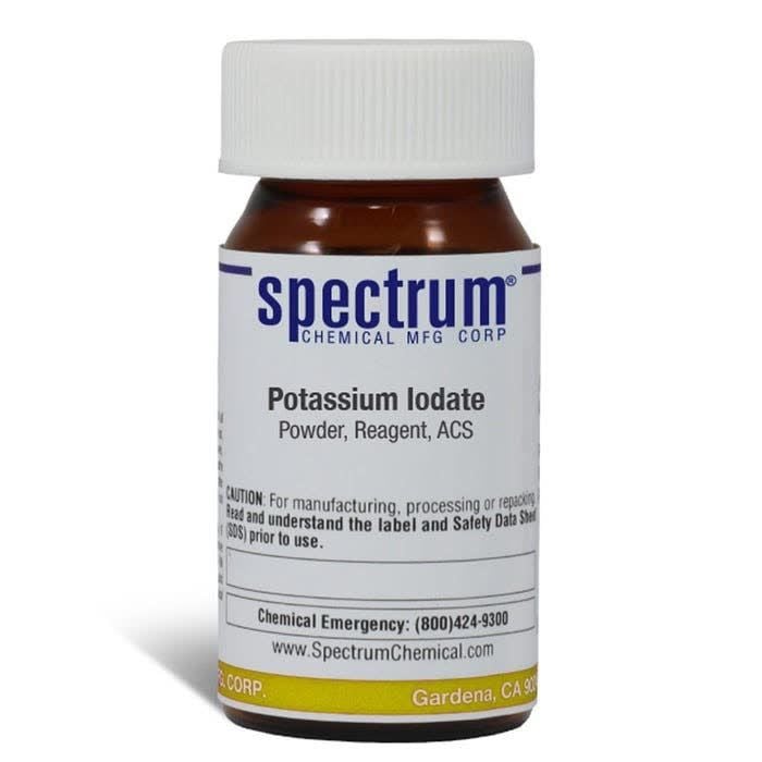 Choose the highest quality solutions and chemicals from Spectrum Chemical. Shop Potassium Iodate, Powder, Reagent, ACS is a chemical compound and oxidizing agent. It is flammable when in contact with reducing agents or combustible materials. It is sometimes utilized for the iodination of table salt to treat iodine deficiency. As an ACS grade quality reagent, its chemical specifications are the de facto standards for chemicals used in many high-purity applications and typically designate the highest quality chemical available for laboratory use. Spectrum Chemical manufactured Reagent ACS grade products meet the toughest regulatory standards for quality and purity.