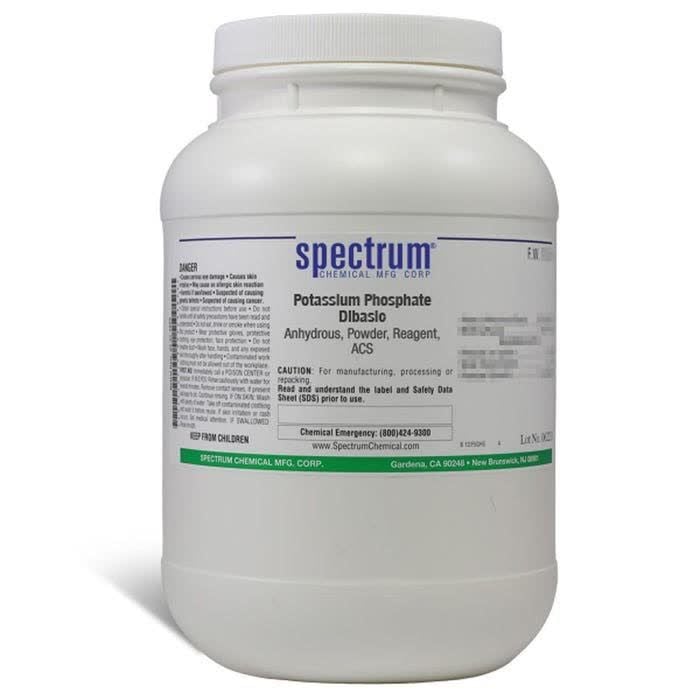 Choose the highest quality solutions and chemicals from Spectrum Chemical. Shop Potassium Phosphate Dibasic, Anhydrous, Powder, Reagent, ACS is a soluble salt that is commonly used as a buffering agent. As an ACS grade Reagent, Spectrum Chemical manufactured potassium phosphate is used as the quality standard against which other substances are graded and has met the toughest regulatory standards for quality and pureness.