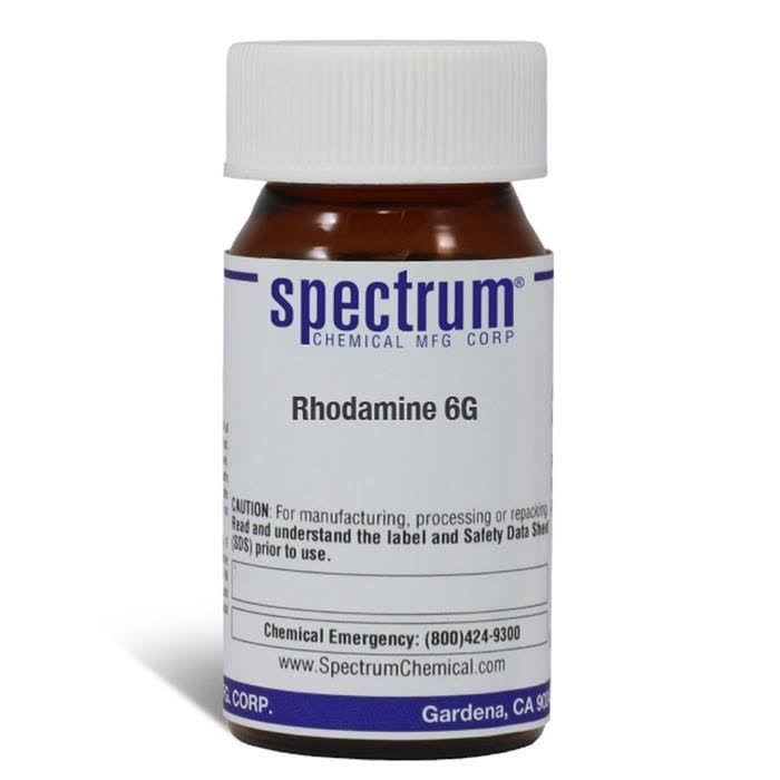 Choose the highest quality solutions and chemicals from Spectrum Chemical. Shop Rhodamine 6G, also known as Rhodamine 590, is a fluorescent rhodamine dye used extensively in biotechnology applications such as fluorescence microscopy, flow cytometry, fluorescence correlation spectroscopy and ELISA. Ungraded products supplied by Spectrum are indicative of a grade suitable for general industrial use or research purposes and typically are not suitable for human consumption or therapeutic use.