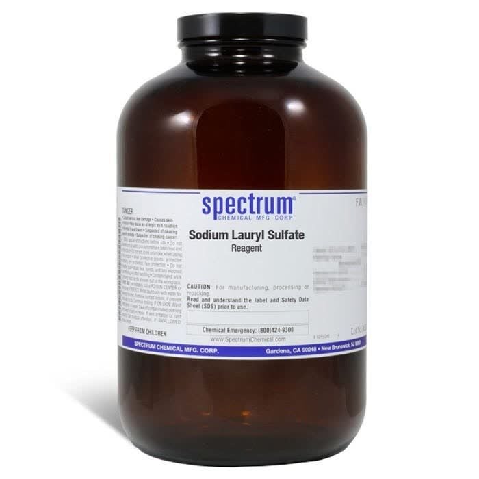 Sodium Lauryl Sulfate, Reagent, is an organic compound, and anionic surfactant derived from coconut or palm oils, for use as a detergent. As an Organosulfate, this salt has the amphiphilic properties needed in a detergent. It's uses vary from shark repellent, fruit fly killer and biocide. Its reagent grade means this is the highest quality commercially available for this chemical and that the American Chemical Society has not officially set any specifications for this material.