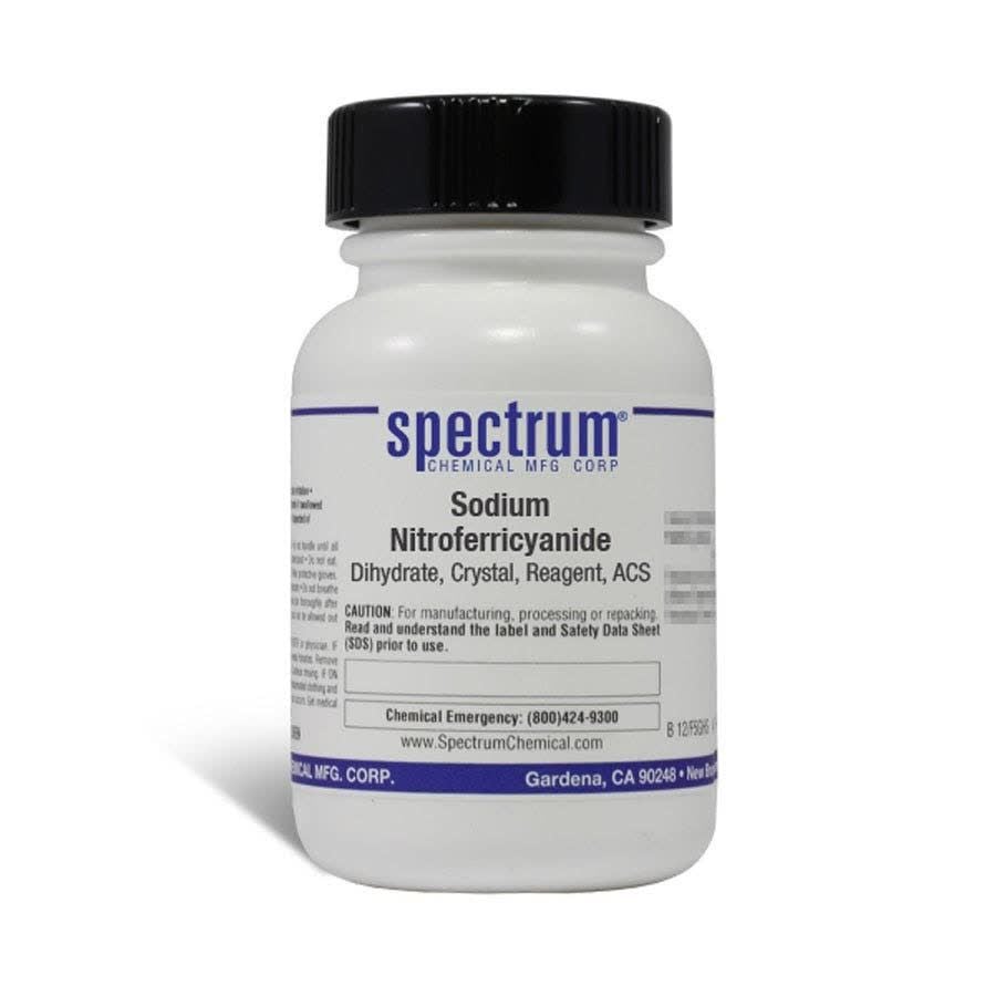 | Chemical Specs | Assay {Na2[Fe(CN)5NO]•2H2O} 99.0-102.0% MAXIMUM LIMITS Insoluble Matter 0.01% Chloride (Cl) 0.02% Sulfate (SO4) To pass test |