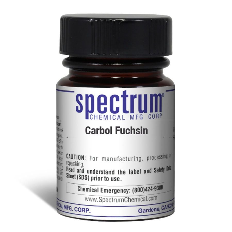 Choose the highest quality solutions and chemicals from Spectrum Chemical. Shop Carbol Fuchsin is a mix of basic fuchsin and phenol which can be used in procedures for bacterial staining to detect acid fast bacteria. Ungraded products supplied by Spectrum are indicative of a grade suitable for general industrial use or research purposes and typically are not suitable for human consumption or therapeutic use.