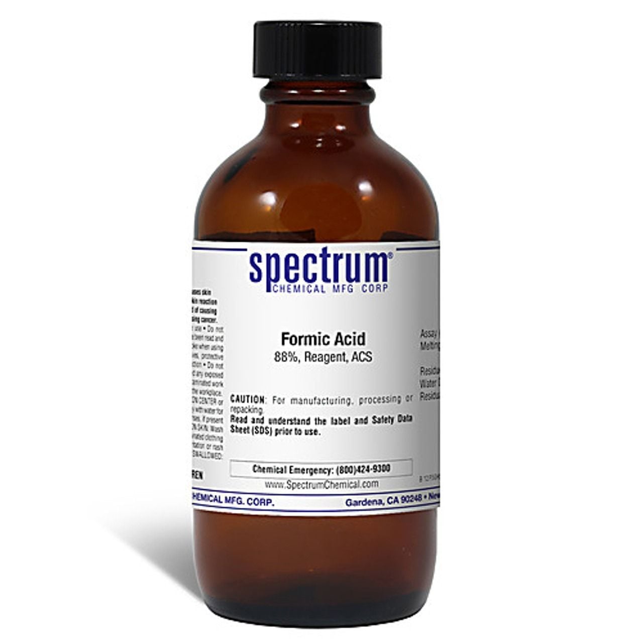 Choose the highest quality solutions and chemicals from Spectrum Chemical. Shop Formic Acid, 88 Percent, Reagent, ACS, also known as methanoic acid, occurs naturally in ant venom. One of its biggest uses is as a preservative agent in livestock feed. It is equally used in the production of leather goods. In the lab it is used as a source of formyl or hydride ion. Its reagent grade means this is the highest quality commercially available for this chemical and that the American Chemical Society has not officially set any specifications for this material.