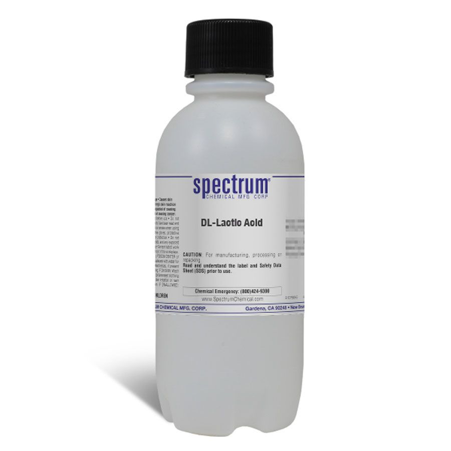 Choose the highest quality solutions and chemicals from Spectrum Chemical. Shop DL-Lactic Acid, Racemic, also known as milk acid, is used in various biochemical processes. Ungraded products supplied by Spectrum are indicative of a grade suitable for general industrial use or research purposes and typically are not suitable for human consumption or therapeutic use.