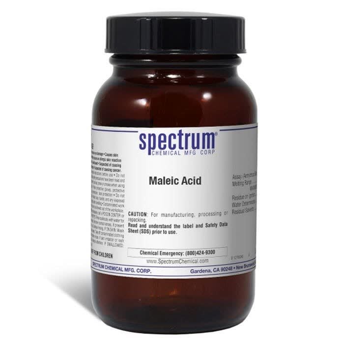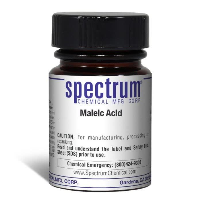 Choose the highest quality solutions and chemicals from Spectrum Chemical. Shop Maleic Acid is used to manufacture of artificial resins, to retard rancidity of fats and oils and in preparing the maleate salts of antihistamines and similar drugs. Ungraded products supplied by Spectrum are indicative of a grade suitable for general industrial use or research purposes and typically are not suitable for human consumption or therapeutic use.