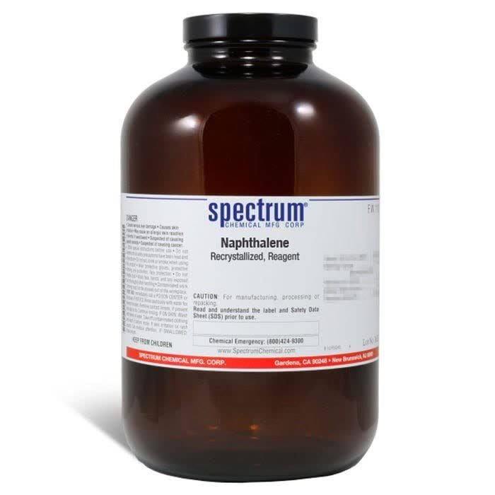 Choose the highest quality solutions and chemicals from Spectrum Chemical. Shop Naphthalene, Recrystallized, Reagent, also known as White tar or Mothballs, is considered the simplest polycyclic aromatic hydrocarbon and is used primarily as a precursor to other chemicals. The Reagent grade denotes that this chemical is the highest quality commercially available and that the American Chemical Society has not officially set any specifications for this material. Spectrum Chemical manufactured Reagent grade products meet the toughest regulatory standards for quality and purity.