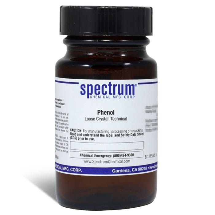 Choose the highest quality solutions and chemicals from Spectrum Chemical. Shop Phenol, Loose Crystal, Technical is a white crystalline, aromatic organic compound that is volatile. It's extracted from petroleum and mainly used as a synthetic building block to produce a wide range of pharmaceutical products and drugs such as aspirin and oral analgesics. Technical grade products supplied by Spectrum are indicative of a grade suitable for general industrial use.