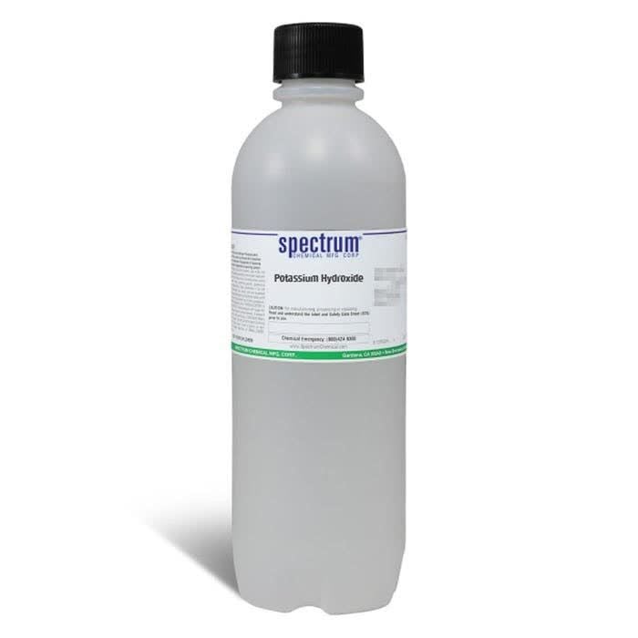 Choose the highest quality solutions and chemicals from Spectrum Chemical. Shop Potassium Hydroxide, 0.1 N Solution - Spectrum solutions utilize the highest quality raw materials appropriate to your product. Most raw materials meet or exceed the specifications established by the American Chemical Society. Where appropriate, many finished products are traceable to NIST Standard Reference Materials. Manufacturing, quality control testing, and packaging are all performed in Spectrum?s own facilities. Record keeping and sample retention of all produced lots ensure product consistency and complete traceability.