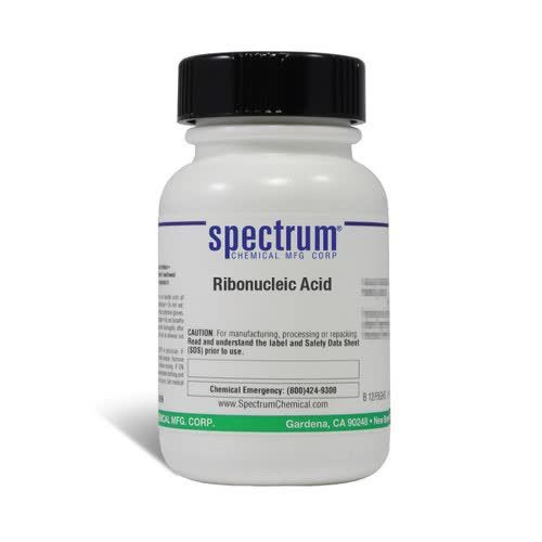 Choose the highest quality solutions and chemicals from Spectrum Chemical. Shop Ribonucleic Acid, also known as RNA, is a polymeric molecule and used in many biological roles including decoding, regulation, and expression of genes. Ungraded products supplied by Spectrum are indicative of a grade suitable for general industrial use or research purposes and typically are not suitable for human consumption or therapeutic use.