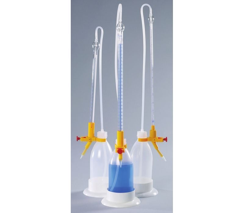 For accurate and reliable titrations across a wide range of applications – from the laboratory to electroplating, water treatment plants, and even field analyses – choose Burkle Automatic Titrating Burettes. These universal aids feature self-zeroing functionality and are meticulously calibrated "to deliver" precise volumes. The burette itself is crafted from high-quality Schott graduated borosilicate glass with clear blue ring graduations and a unique Schellbach stripe, ensuring easy and accurate reading of measurements that meet Category B tolerances (DIN ISO 385).