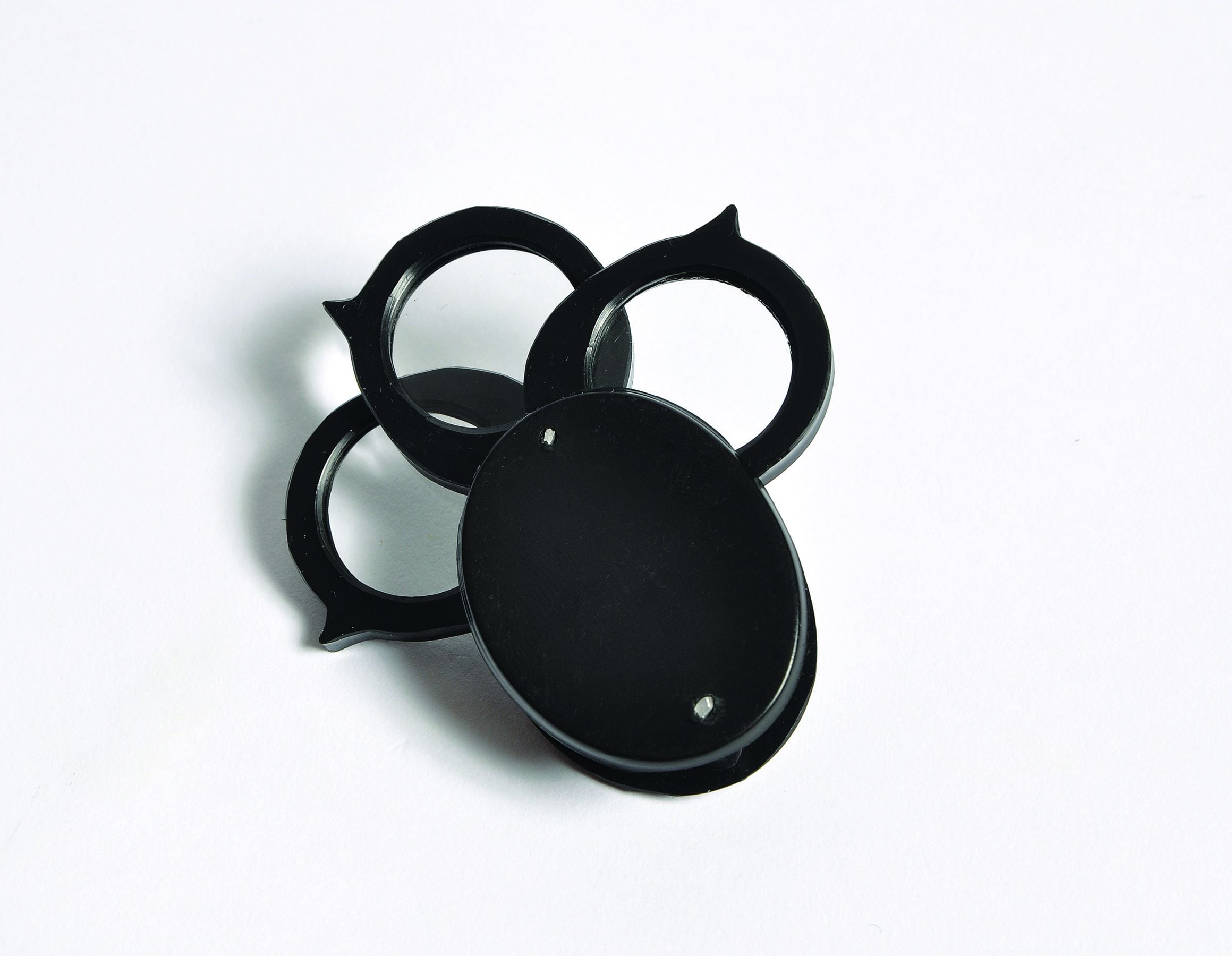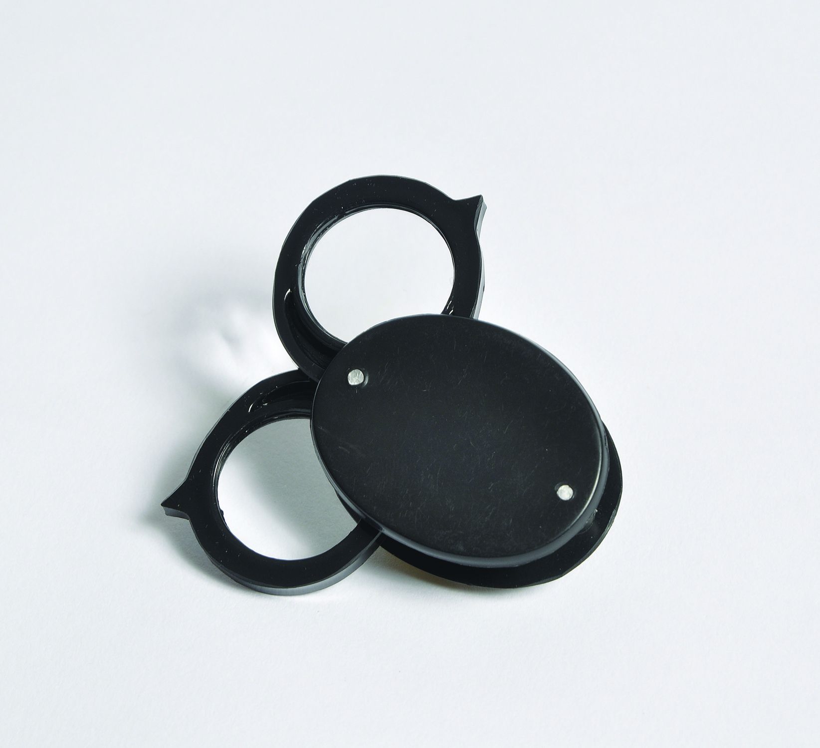 Folding magnifiers in plastic cases. Glass lenses are 25mm in diameter with 5x magnification. Single magnifier includes one lens. Double magnifier includes two lenses for 10x magnification. Triple magnifier includes three lenses for 15x magnification.