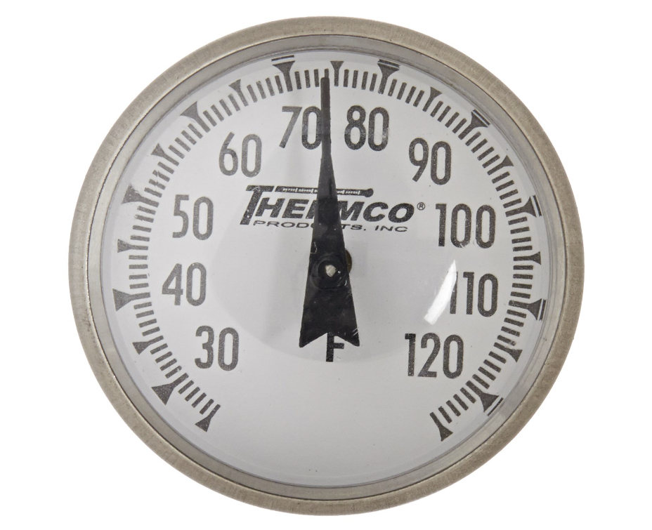 Thermco’s BI-METAL Dial Thermometers feature quality construction and design with easy-to-read black scale on a white background. The accuracy of these thermometers is +/- 1% over the entire scale. All stainless steel case, stem, and bezel for superior shock protection, even in extreme conditions. The lens is made from unbreakable polycarbonate. An external nut provides for easy recalibration. Immersion is approximately 2” (50mm). Supplied with a convenient plastic stem case that has a pocket clip. This case can also be used as a handle for the thermometer.