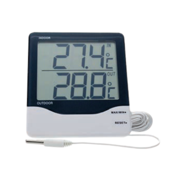 The Thermco Products Large Digit Min/Max Digital Thermometer offers precise temperature monitoring with a dual temperature display for both internal (0°C to 50°C) and external (-50°C to 70°C) readings. Featuring a large, easy-to-read display, this thermometer includes an internal sensor and a 10 foot external probe for versatile indoor and outdoor use, while the min, max, and hold functions provide comprehensive tracking.