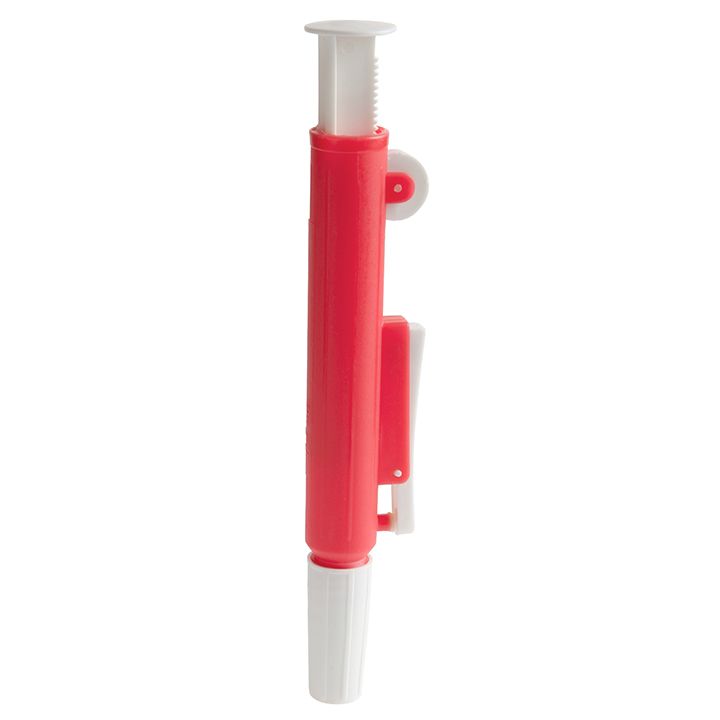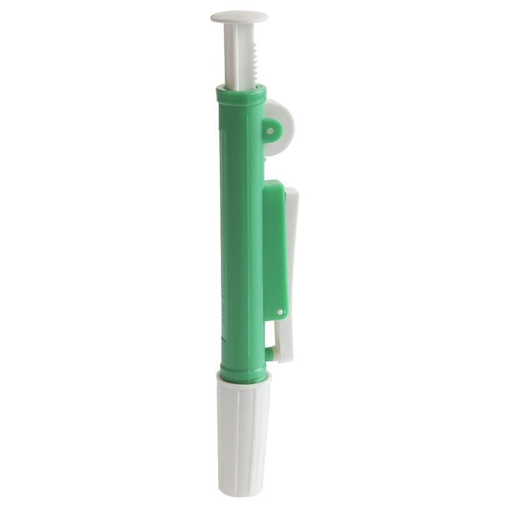 The pi-pump®'s primary benefit is its precise, wheel-based control. Users simply rotate the wheel forward or backward for easy and accurate filling or emptying of the pipette. When the wheel is stopped, the piston remains in the required position, securely holding the liquid until ejection. The device provides a firm, positive fit for all standard pipettes and is color-coded by size (Blue for 2 mL, Green for 10 mL, Red for 25 mL) for quick identification, streamlining your preparation workflow.