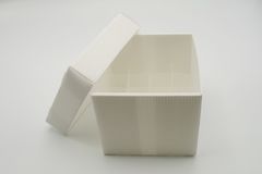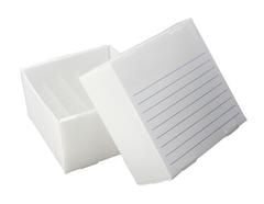 Freezer boxes (cryo box) by Heathrow Scientific, were designed with sustainability in mind and are made from a specially formulated corrugated or thin film polypropylene. The freezer boxes are moisture resistant, which significantly reduces the chance of mold growth. With superior durability, polypropylene outlasts the cardboard box alternatives that are susceptible to softening and producing dust and can freeze (down to temperatures of -80°C) and thaw multiple times without a problem. When it comes to saving valuable lab space, these boxes are supplied "flat-packed", which eliminates the hassle of stacking and reduces the amount of space needed for test tube storage. When ready to use, assembly is easy and pre-assembled dividers are included with each box. Freezer boxes come complete in packs of 10, and multiple sizes and colors are available.