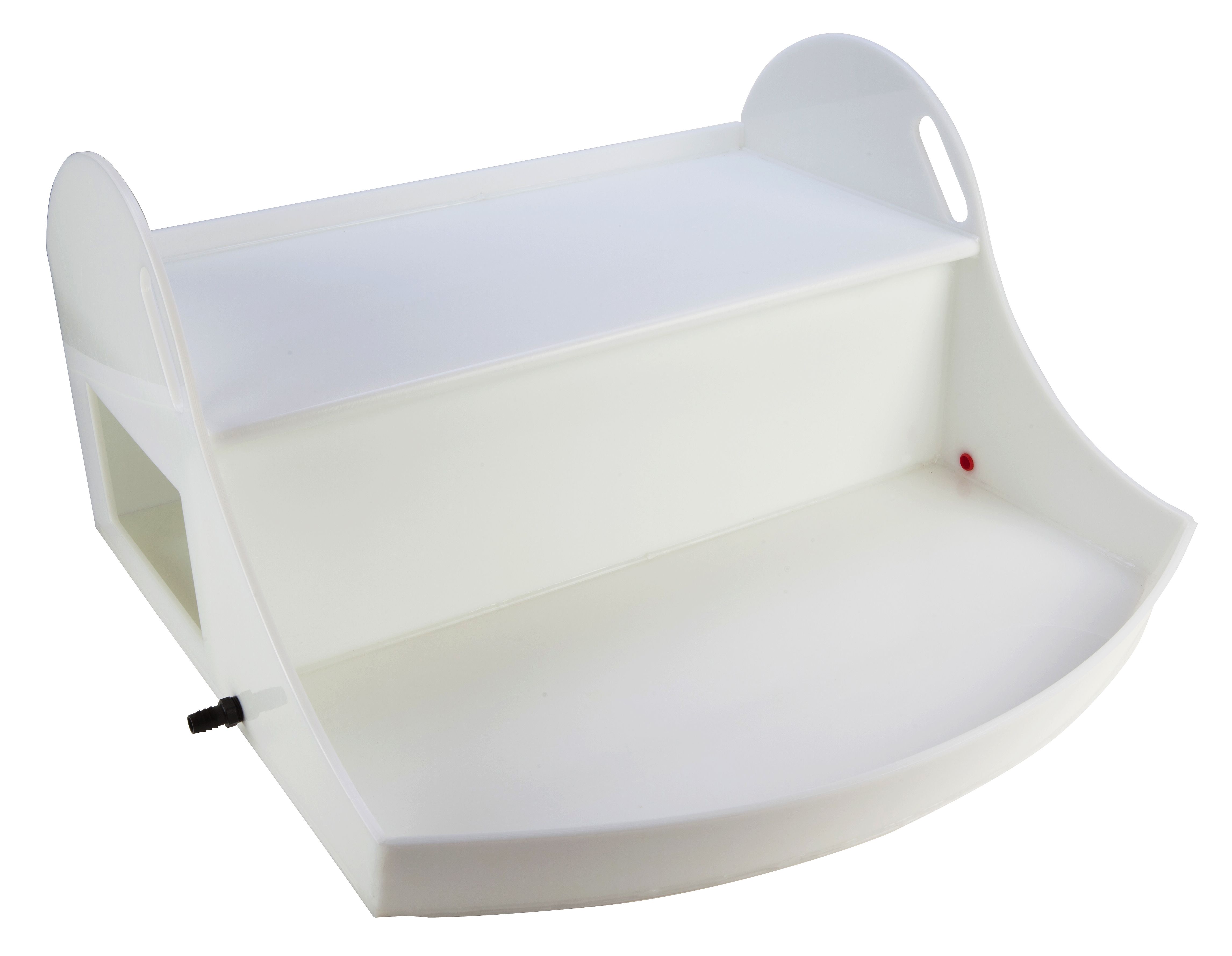 The carboy spill tray contains two convenient drain ports and a 1/2 in tubulation connection on the lower trough. It also has a built-in lower bin and side handles for storage and transportation.