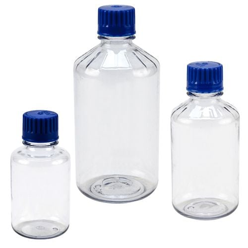 Lexan® Polycarbonate labware is a safer alternative to glass. It is ideal for steam sterilization of all biologicals, liquids, reagents, media, buffers, and aqueous solutions. Manufactured in a Class 10K cleanroom in an ISO 9001 facility with virgin Lexan® Polycarbonate resin that is durable, chemically inert, non-leaching, and optically superior. Bottles are provided non-sterile with standard blue autoclavable caps engaged.