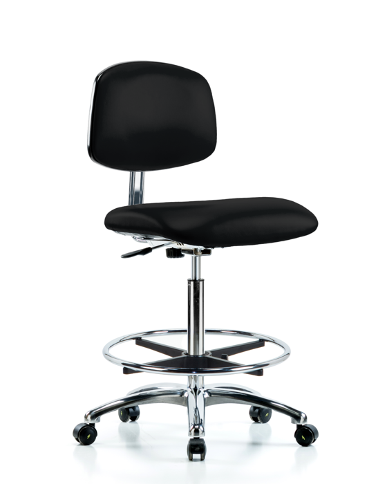ESD & Class 10 Clean Room Chrome Base Vinyl Chairs, High Bench Height is adjustable from 26 - 35.5 inches from the top of the seat to the floor and features manual back height and depth adjustments, electro-static dissipating components to ensure proper grounding, and cast-aluminum base with dual-wheel, self-braking, non-marring ESD casters or non-marring ESD glides. Each foot option is suitable for hard floors in electro-static dissipating vinyl.