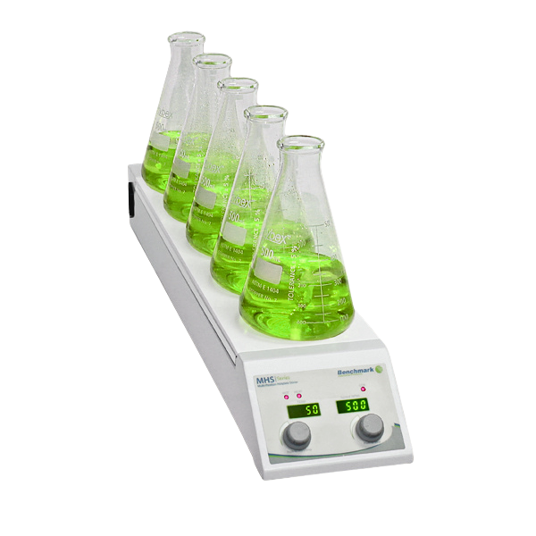 - Increased spacing (100 mm) between stirring positions allows the acceptance of a wide range of vessel types, including beakers, Erlenmeyer flasks, and media storage bottles