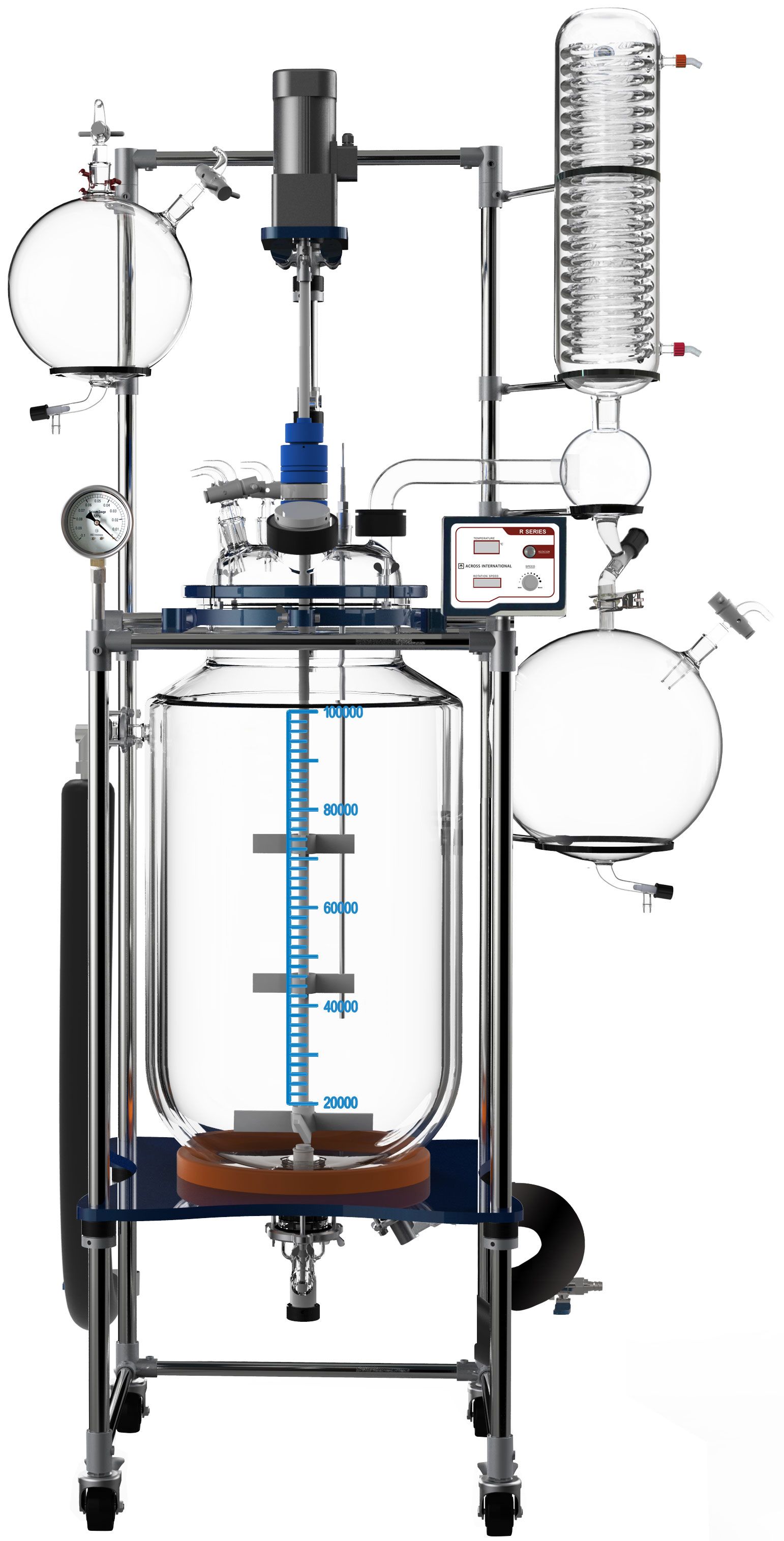 - Heavy duty stainless steel supporting framework with lockable casters for mobility and stability (whole support and glass vessel shipped pre-assembled)