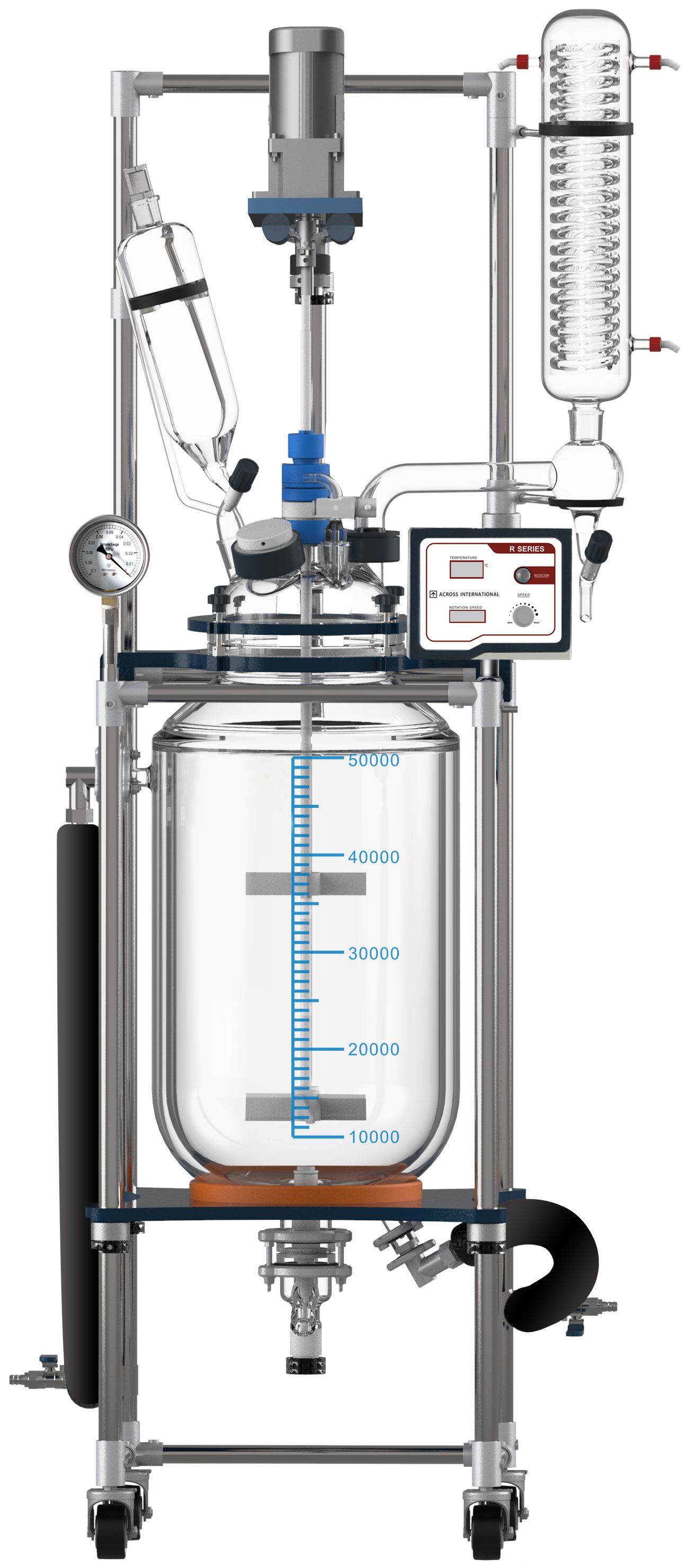 Across International's R-series single/dual jacketed glass reactors are designed for synthetic reaction of different types of materials in a controlled temperature and vacuum environment. Each reactor features adjustable stirring speeds and a constant pressure feeding funnel that allows you to add material to the vessel at a uniform and controlled speed. The built-in condenser makes it possible to recover some materials, also at a controlled rate of speed.