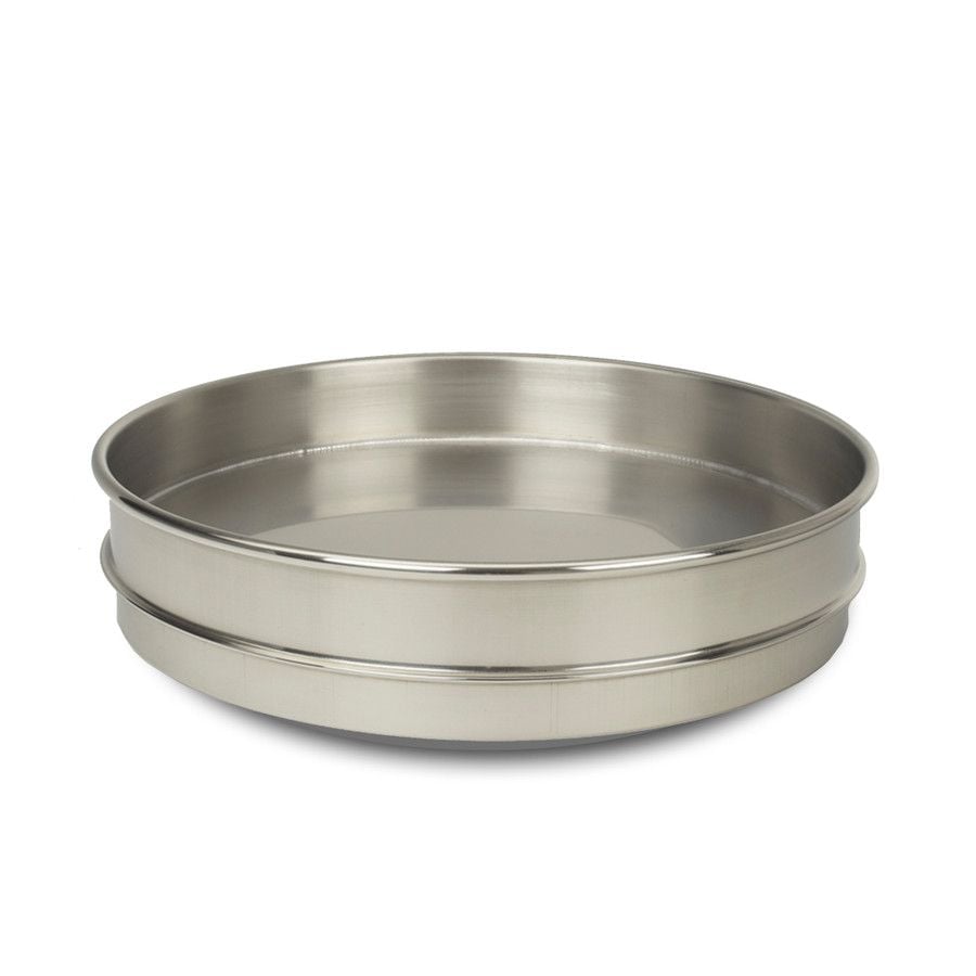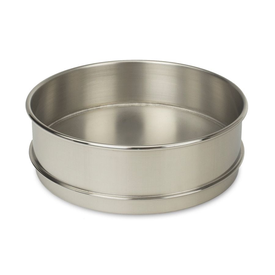 Designed to assist with sifting using a laboratory sieve, these 8" stainless steel covers, bottom pans, and intermediate pans help prevent the loss of materials during the process. Covers prevent loss from the top part of the sieve, and intermediate pans fit between the sieve and the bottom pan, where the last bits of materials collect. Choose between half-height or full-height.