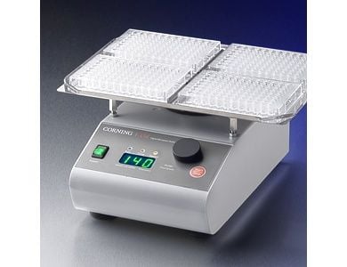 The Corning LSE Digital Microplate Shaker features digital control of shaking speed and run time. A single control knob is used to set parameters, and values are shown on a large 3-digit display. A sturdy base encloses the motor for quiet, vibration-free operation. The included stainless steel platform accommodates up to 4 microplates (standard or deep well) and the shaker is safe for use in temperature controlled environments from 4 to 65°C.