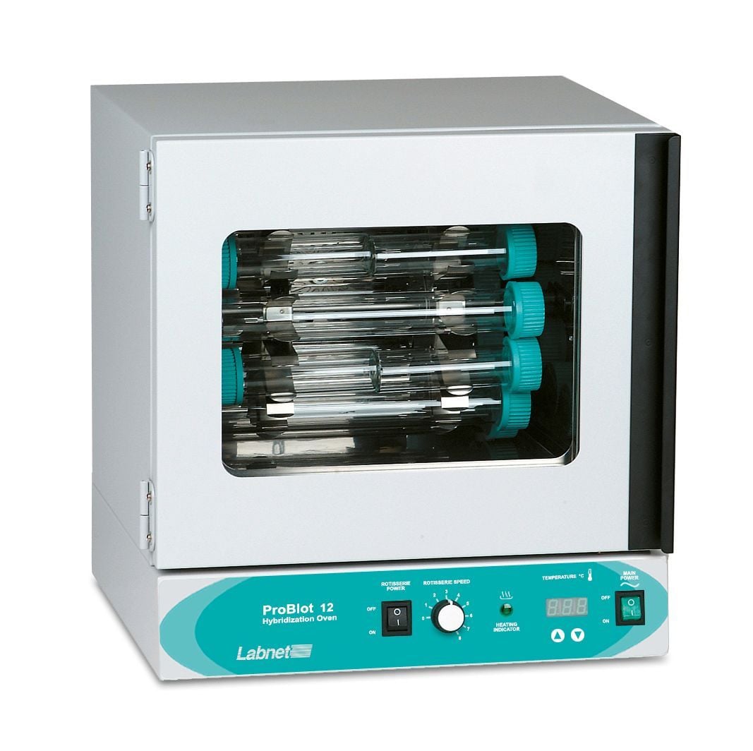The complex processes of blotting and hybridization in molecular and biochemical laboratories become easier and more efficient with Labnet’s ProBlot™ 6 and 12 Hybridization Ovens. Blotting refers to the transfer of DNA to a membrane, and hybridization refers to the process of incubating membranes for the purpose of joining two different strands of individually identified DNA strands into one. Precise temperature control and stability provide trustworthy, reproducible results across multiple projects. Variable speed and adjustable axis rotisserie ensure that the desired level of agitation is achieved during the hybridization process. A glass door allows for observation of the process without compromising the results.