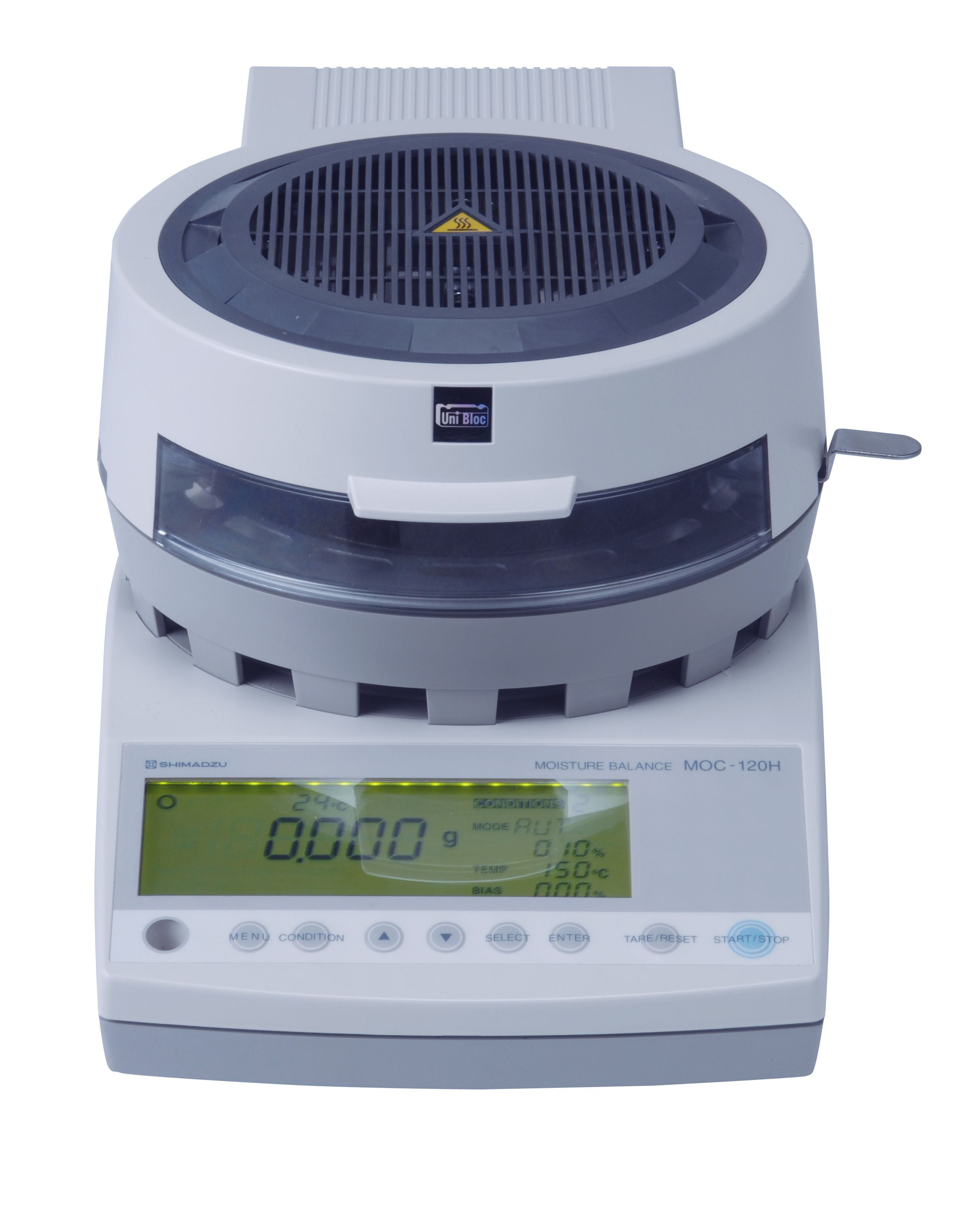 The MOC-120H Electronic Moisture Analyzer from Shimadzu (with an Unibloc weight sensor) is an easy, reliable moisture content measurement that uses an array of drying nodes for samples of various sizes and conditions. The drying status can be seen at-a-glance with the fluctuation range display.