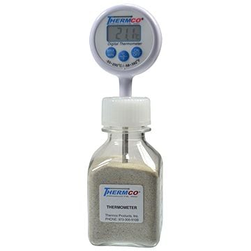 Thermco's Lollipop Digital Bottle Thermometers accurately monitors the temperatures of, refrigerators, incubators, block heater/dry baths, and rooms. The minimum/maximum feature monitors critical temperature for any period of time, such as overnight or weekend. The accuracy is ± 1.0ºC. Each temperature probe is housed in unbreakable plastic 60 mL bottle filled Sand Medium.