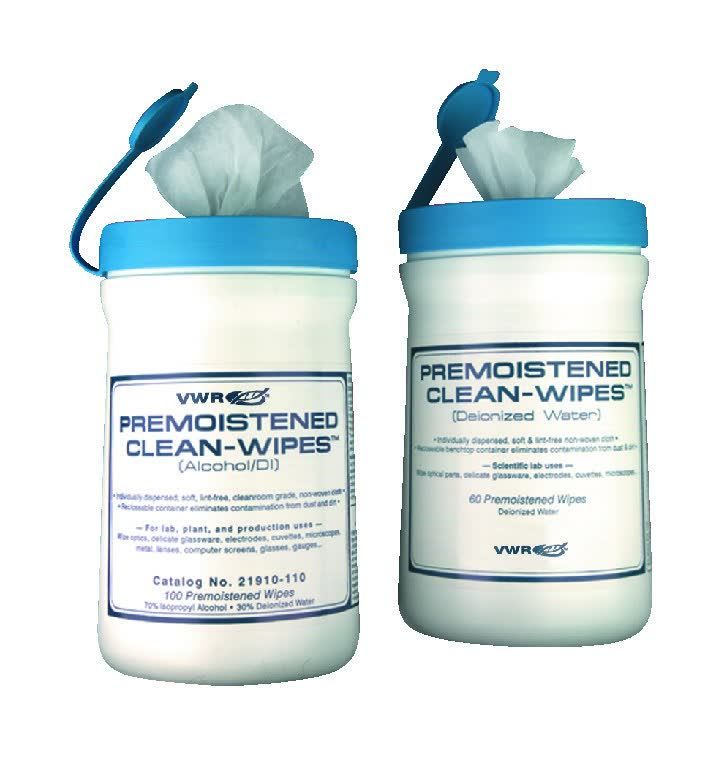 Wipes are available premoistened with 70% reagent-grade isopropyl alcohol and 30% reagent-grade deionized water, 100% pure reagent-grade deionized water, or an eyeglass cleaning solution. They are also available dry. Dry wipes may be used with any liquid by simply adding 236.6 mL (8oz.) of the liquid to the wipe canister.